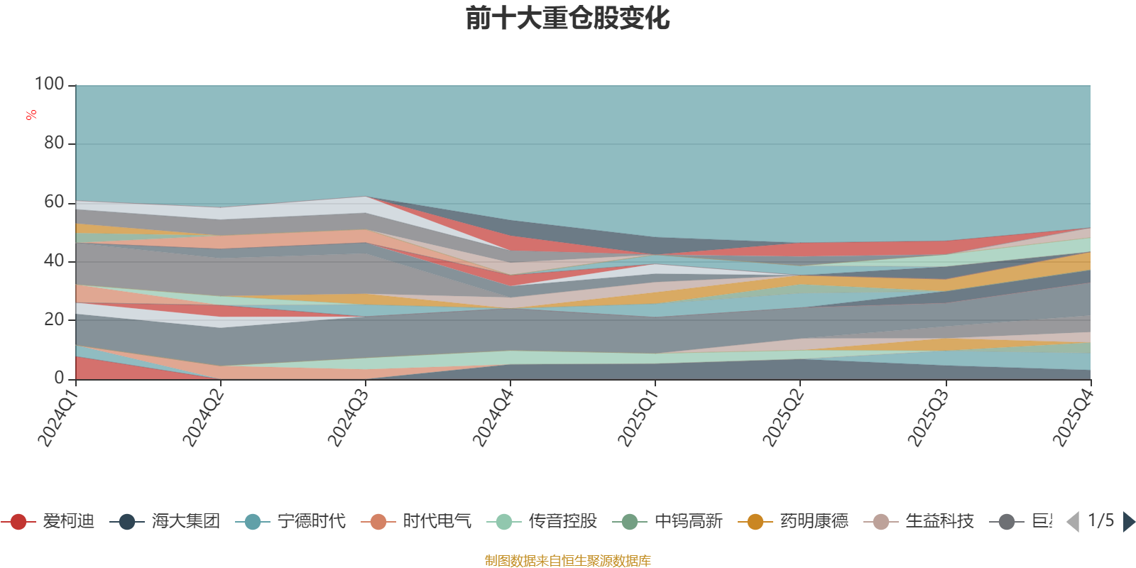 截至2025年四季度末,基金十大重仓股分别是华峰铝业、紫金矿业、宁德时代、巨星科技、银轮股份、海力风电、生益科技、中钨高新、巨化股份、海大集团。