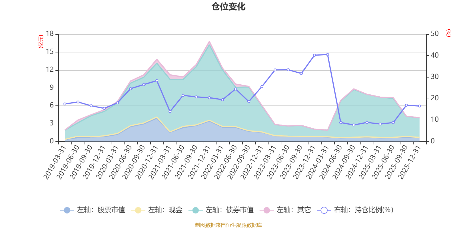 基金管理人在四季报中表示,报告期间,组合规模小幅下降。纯债方面,组合整体以中性久期运行,节奏上,考虑到经济基本面和资金面均对债券形成支撑,组合阶段性通过利率债调节了组合久期,并未全面转向防守。结构上,底仓品种仍以高等级信用债和银行资本补充工具为主以获取票息收益,并持续对期限结构及持仓个券进行优化。权益方面,结合估值位置进行了行业再平衡,减持拥挤度较高的科技板块,增配了有反内卷预期、具有一定赔率的周期品种,以及受益于全球制造业景气度复苏的出口链,对于基本面弱化的内需顺周期品种保持相对谨慎,但考虑到相关板块估值处于低位,后续积极关注政策应对带来的预期拐点。