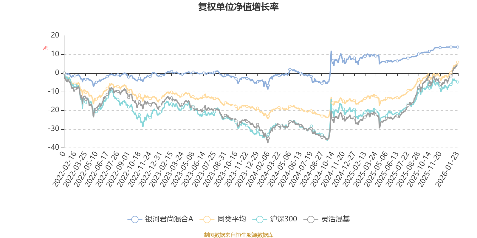 截至1月23日,银河君尚混合A近三个月复权单位净值增长率为1.53%,位于同类可比基金99/119;近半年复权单位净值增长率为5.27%,位于同类可比基金91/119;近一年复权单位净值增长率为5.59%,位于同类可比基金105/119;近三年复权单位净值增长率为13.69%,位于同类可比基金57/119。