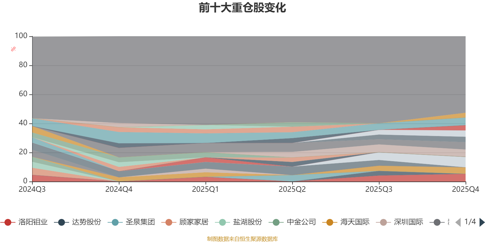 截至2025年四季度末,基金十大重仓股分别是兆易创新、中国移动、洛阳钼业、豪迈科技、腾讯控股、海天国际、东航物流、紫金矿业、百胜中国、兴发集团。