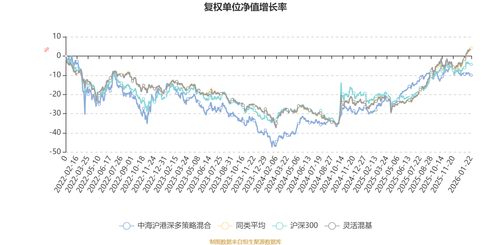 截至1月22日,中海沪港深多策略混合近三个月复权单位净值增长率为-1.48%,位于同类可比基金1219/1286;近半年复权单位净值增长率为1.53%,位于同类可比基金1189/1286;近一年复权单位净值增长率为28.00%,位于同类可比基金756/1286;近三年复权单位净值增长率为4.31%,位于同类可比基金940/1286。