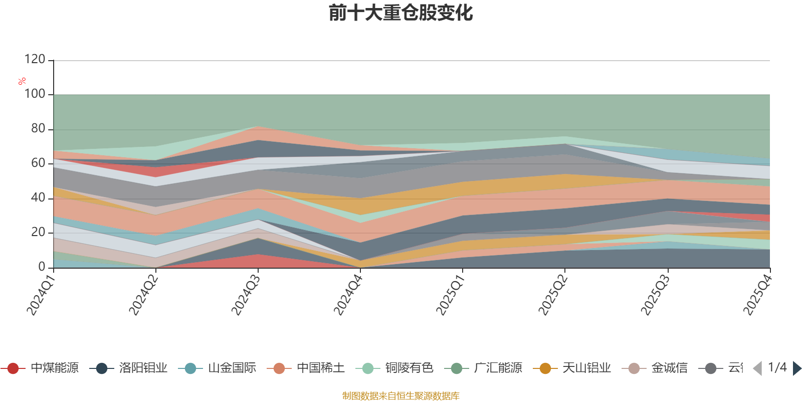 该基金持股集中度较高,近2年前十大重仓股集中度长期超过60%。截至2025年四季度末,基金十大重仓股分别是紫金矿业、洛阳钼业、中矿资源、藏格矿业、铜陵有色、天山铝业、云铝股份、华友钴业、江西铜业、天华新能。