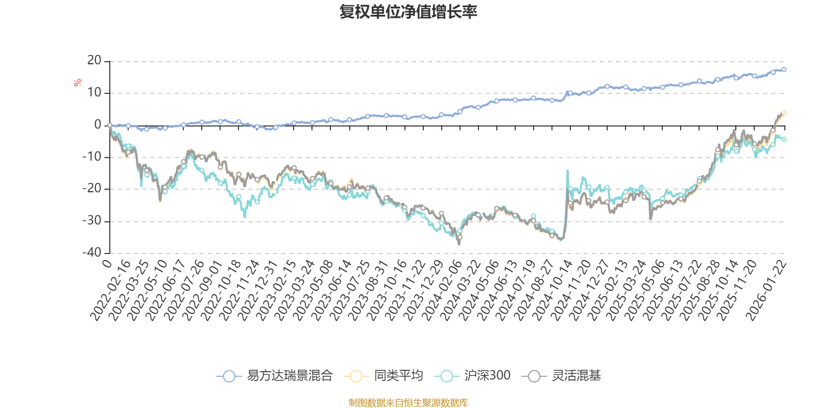 截至1月22日,易方达瑞景混合近三个月复权单位净值增长率为2.32%,位于同类可比基金1017/1286;近半年复权单位净值增长率为3.18%,位于同类可比基金1126/1286;近一年复权单位净值增长率为5.33%,位于同类可比基金1195/1286;近三年复权单位净值增长率为17.28%,位于同类可比基金610/1286。