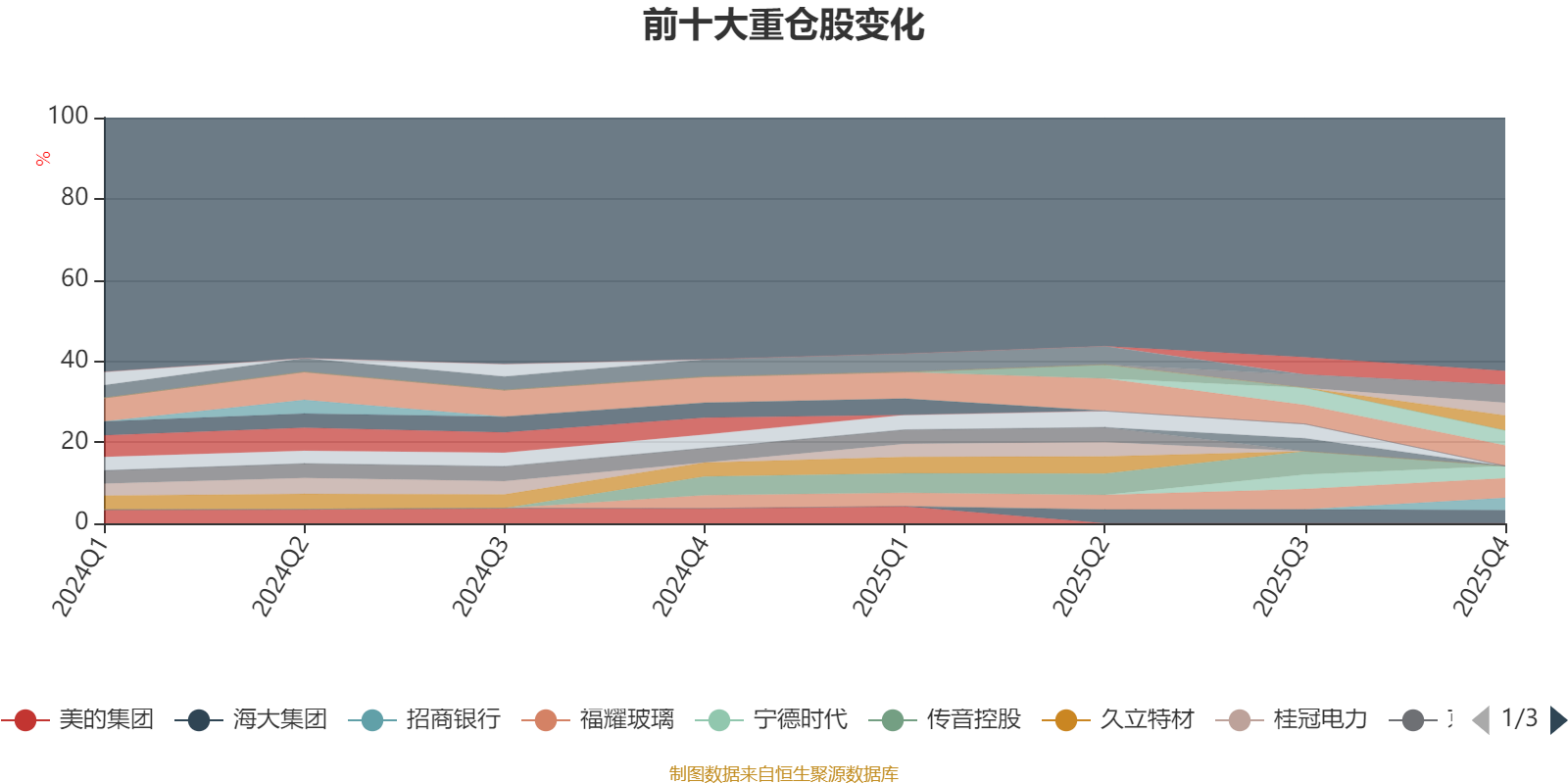截至2025年四季度末,基金十大重仓股分别是长江电力、福耀玻璃、中国平安、瀚蓝环境、中天科技、牧原股份、海大集团、贵州茅台、宁德时代、招商银行。