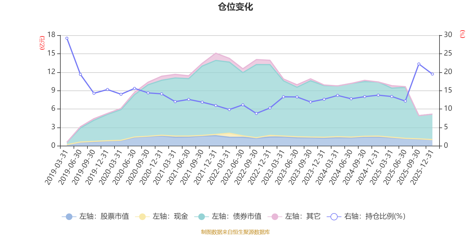 据定期报告数据统计,近三年平均股票仓位为14.32%,同类平均为72.57%。2019年一季度末基金达到29.2%的最高仓位,2022年三季度末最低,为8.79%。