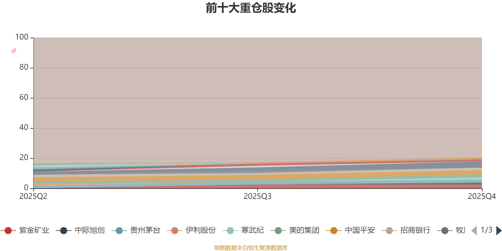 截至2025年四季度末,基金十大重仓股分别是宁德时代、中国平安、紫金矿业、美的集团、贵州茅台、招商银行、中际旭创、寒武纪、中国神华、三一重工。