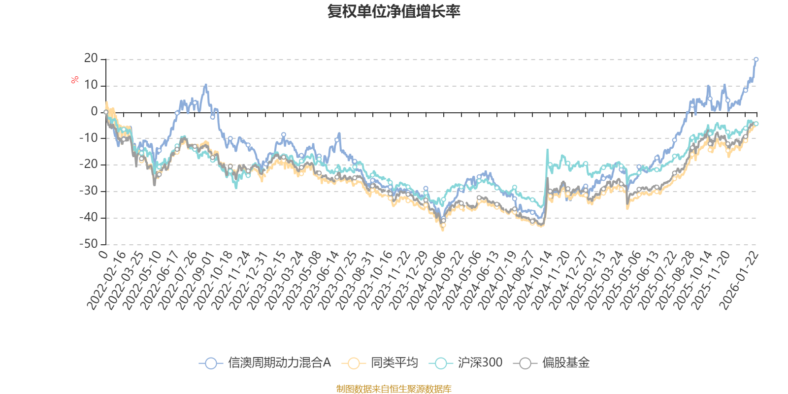 截至1月22日,信澳周期动力混合A近三个月复权单位净值增长率为18.81%,位于同类可比基金22/265;近半年复权单位净值增长率为34.03%,位于同类可比基金65/265;近一年复权单位净值增长率为60.83%,位于同类可比基金43/265;近三年复权单位净值增长率为40.70%,位于同类可比基金56/256。