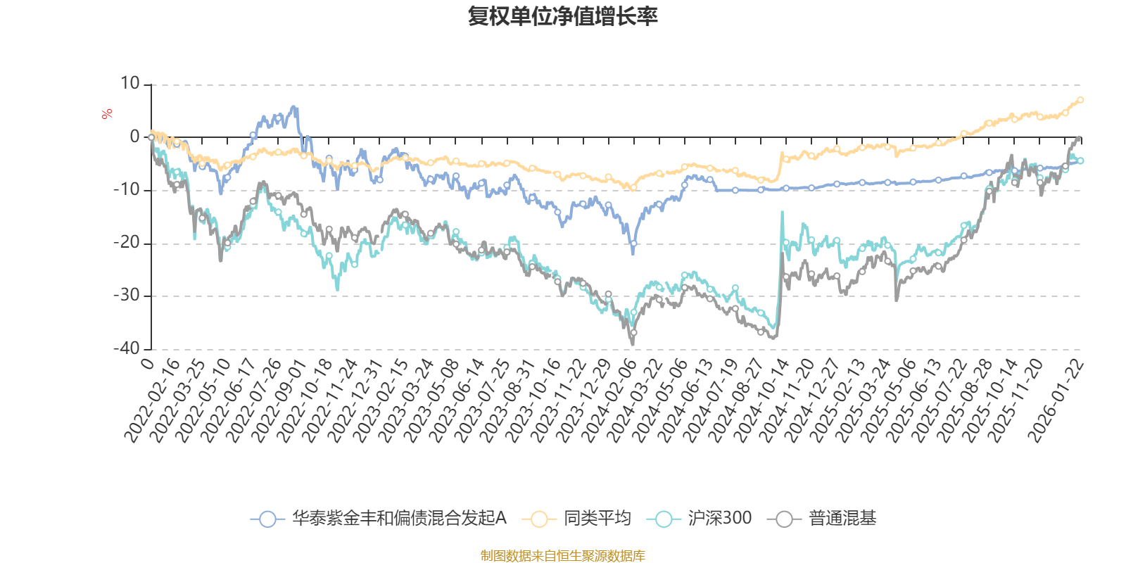 截至1月22日,华泰紫金丰和偏债混合发起A近三个月复权单位净值增长率为2.09%,位于同类可比基金323/629;近半年复权单位净值增长率为3.07%,位于同类可比基金426/629;近一年复权单位净值增长率为4.69%,位于同类可比基金502/626;近三年复权单位净值增长率为-2.24%,位于同类可比基金551/564。