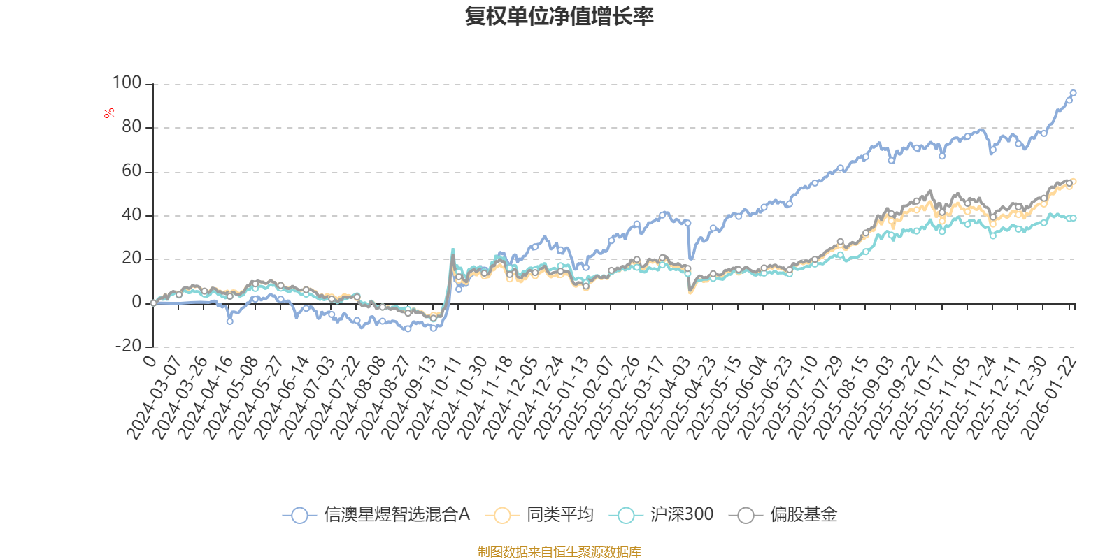 截至1月22日,信澳星煜智选混合A近三个月复权单位净值增长率为13.72%,位于同类可比基金203/689;近半年复权单位净值增长率为22.72%,位于同类可比基金367/689;近一年复权单位净值增长率为59.74%,位于同类可比基金111/673。