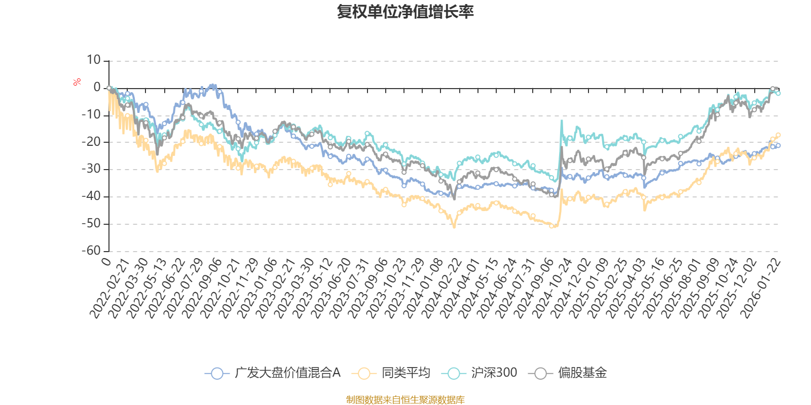 截至1月22日,广发大盘价值混合A近三个月复权单位净值增长率为6.27%,位于同类可比基金435/621;近半年复权单位净值增长率为7.62%,位于同类可比基金542/621;近一年复权单位净值增长率为17.92%,位于同类可比基金544/613;近三年复权单位净值增长率为-8.07%,位于同类可比基金465/535。