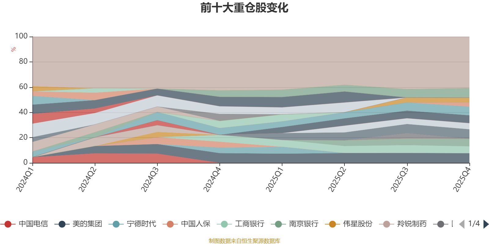 该基金持股集中度较高。截至2025年四季度末,基金十大重仓股分别是美的集团、中国平安、宁波银行、华泰证券、兴业银行、南京银行、工商银行、交通银行、中信证券、东方电缆。
