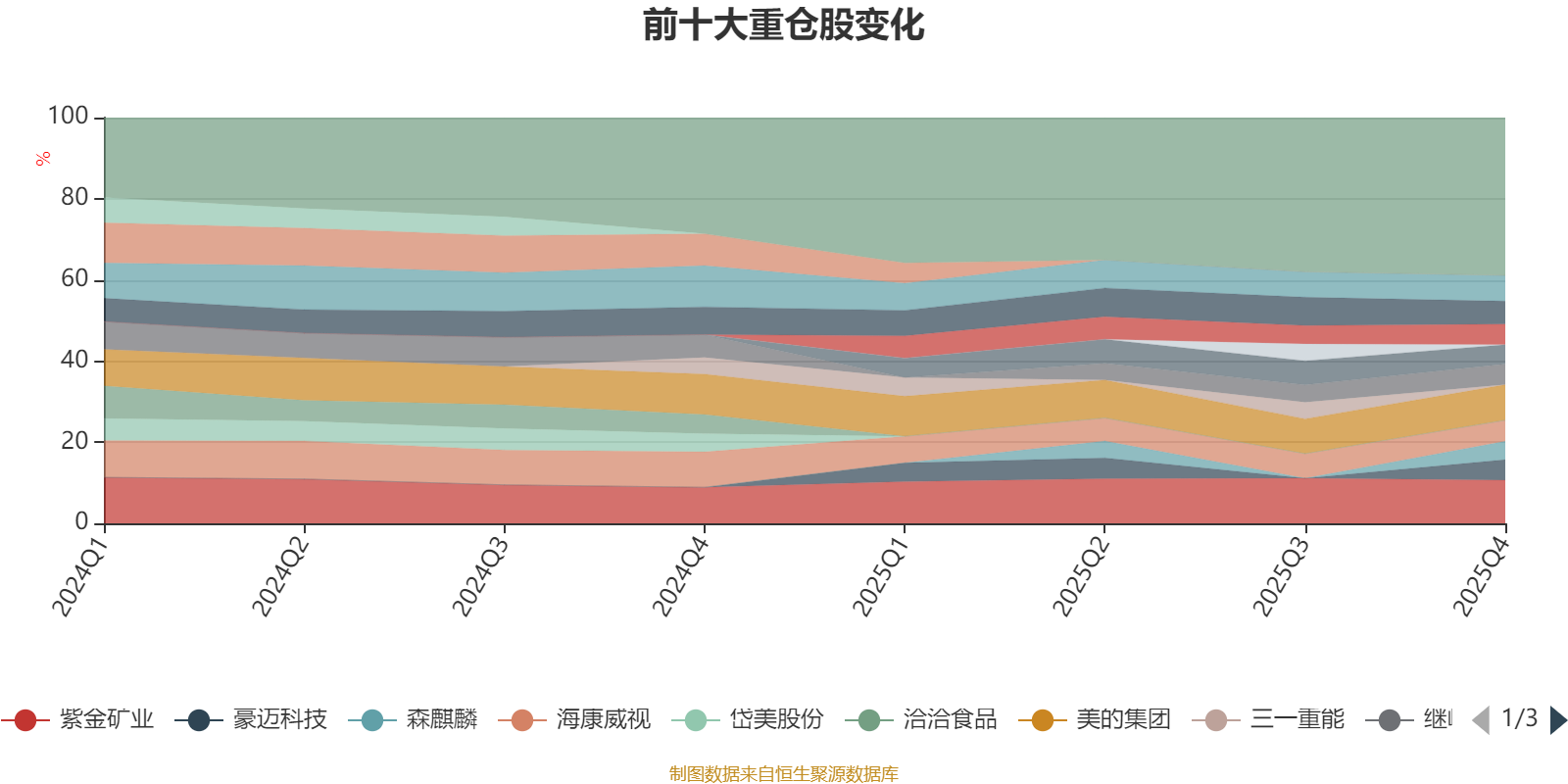 该基金持股集中度较高,近2年前十大重仓股集中度长期超过60%。截至2025年四季度末,基金十大重仓股分别是紫金矿业、美的集团、伟星股份、分众传媒、海康威视、继峰股份、豪迈科技、久立特材、杰克科技、森麒麟。