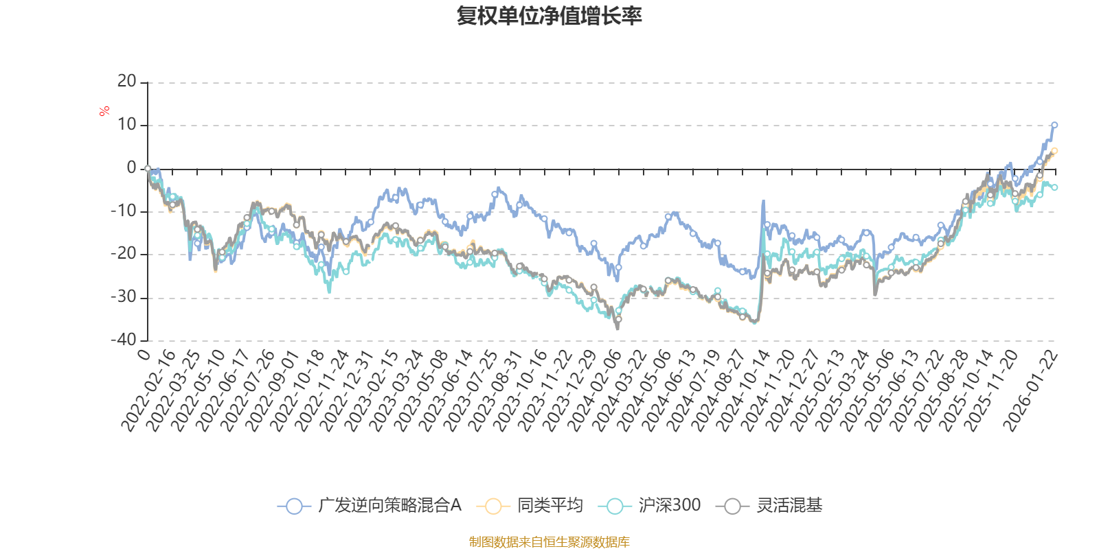 截至1月22日,广发逆向策略混合A近三个月复权单位净值增长率为14.68%,位于同类可比基金302/1286;近半年复权单位净值增长率为26.78%,位于同类可比基金503/1286;近一年复权单位净值增长率为33.91%,位于同类可比基金618/1286;近三年复权单位净值增长率为17.71%,位于同类可比基金603/1286。