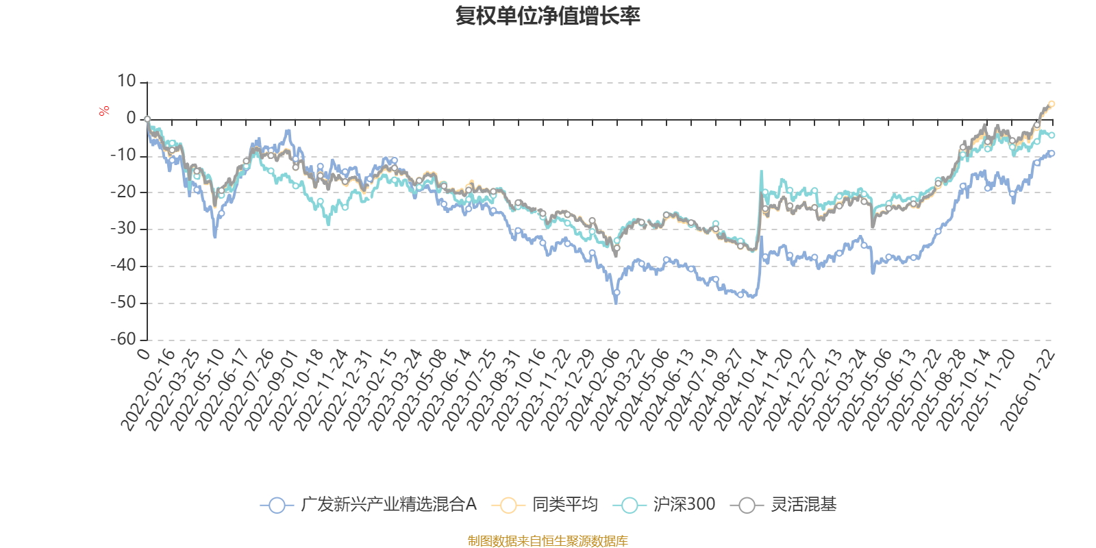 截至1月22日,广发新兴产业精选混合A近三个月复权单位净值增长率为10.13%,位于同类可比基金560/1286;近半年复权单位净值增长率为30.46%,位于同类可比基金433/1286;近一年复权单位净值增长率为44.57%,位于同类可比基金413/1286;近三年复权单位净值增长率为3.69%,位于同类可比基金953/1286。