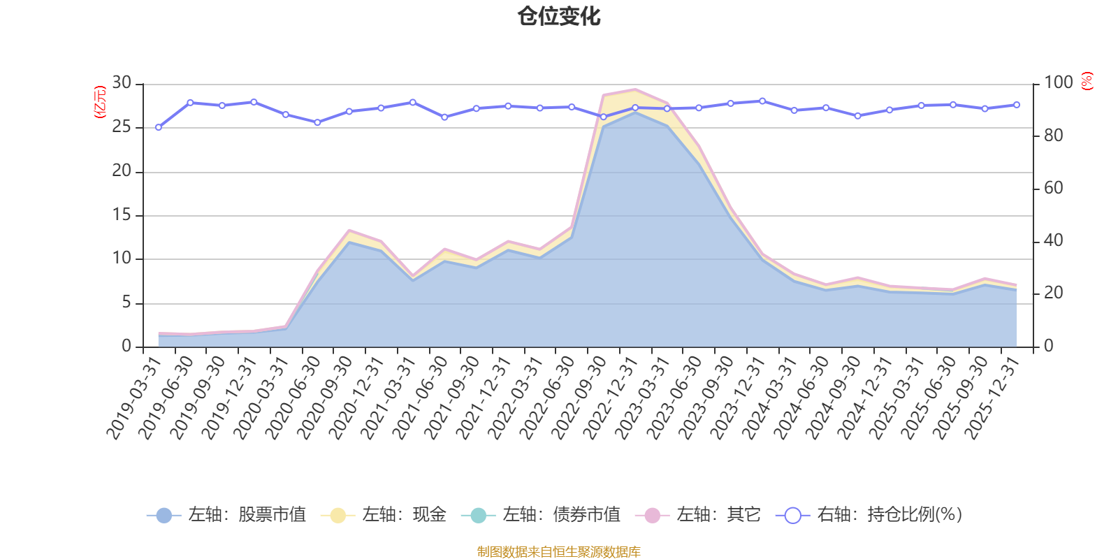 据定期报告数据统计,近三年平均股票仓位为91.06%,同类平均为72.57%。2023年末基金达到93.48%的最高仓位,2019年一季度末最低,为83.5%。