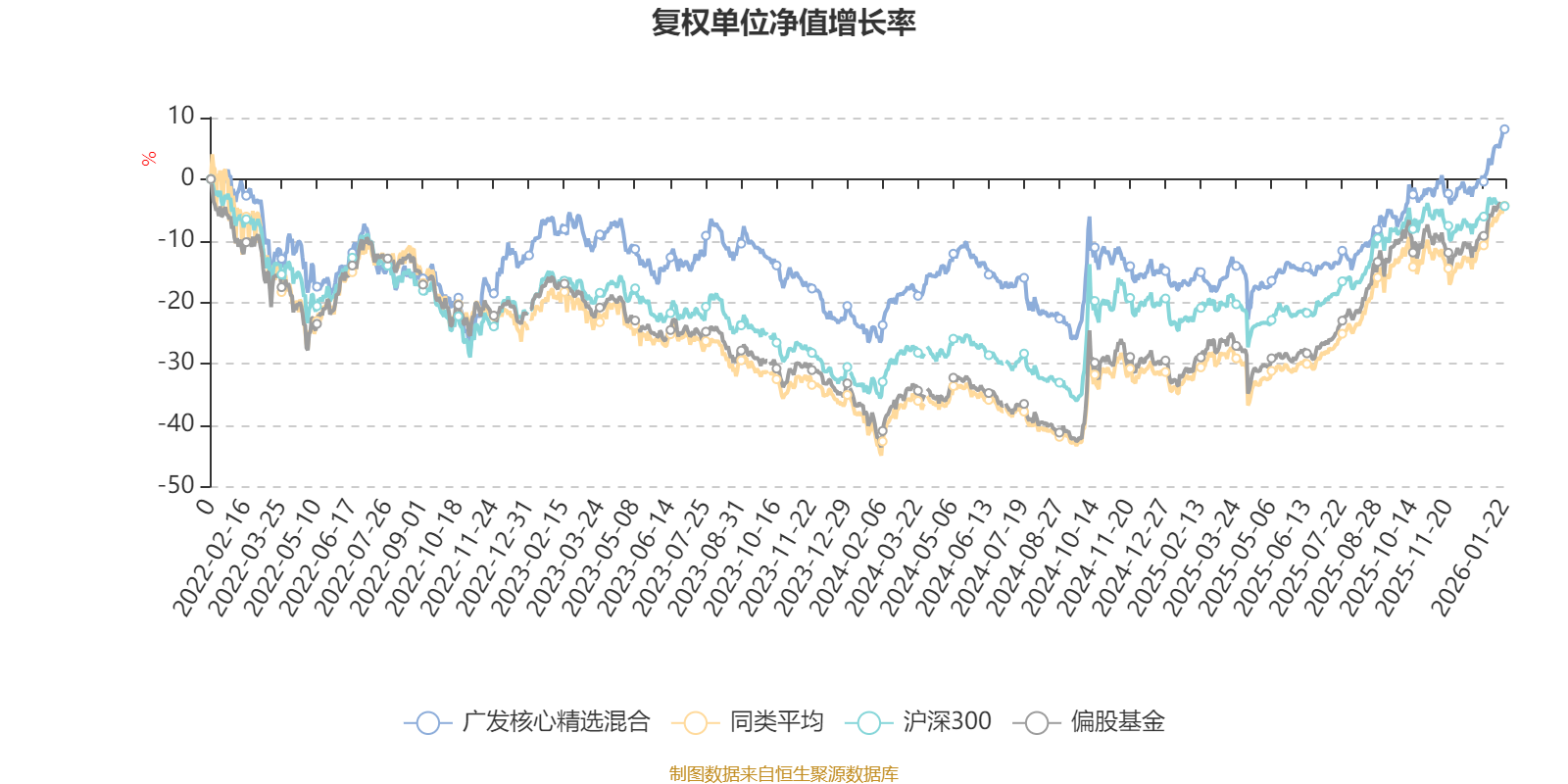 截至1月22日,广发核心精选混合近三个月复权单位净值增长率为11.79%,位于同类可比基金88/265;近半年复权单位净值增长率为22.36%,位于同类可比基金152/265;近一年复权单位净值增长率为30.57%,位于同类可比基金196/265;近三年复权单位净值增长率为15.62%,位于同类可比基金140/256。