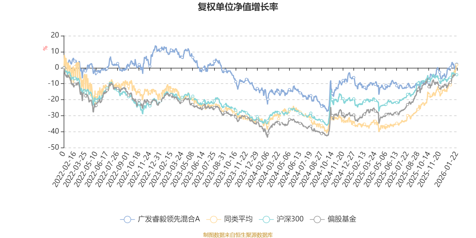 截至1月22日,广发睿毅领先混合A近三个月复权单位净值增长率为7.07%,位于同类可比基金44/49;近半年复权单位净值增长率为15.49%,位于同类可比基金44/49;近一年复权单位净值增长率为14.21%,位于同类可比基金46/46;近三年复权单位净值增长率为-9.46%,位于同类可比基金29/30。
