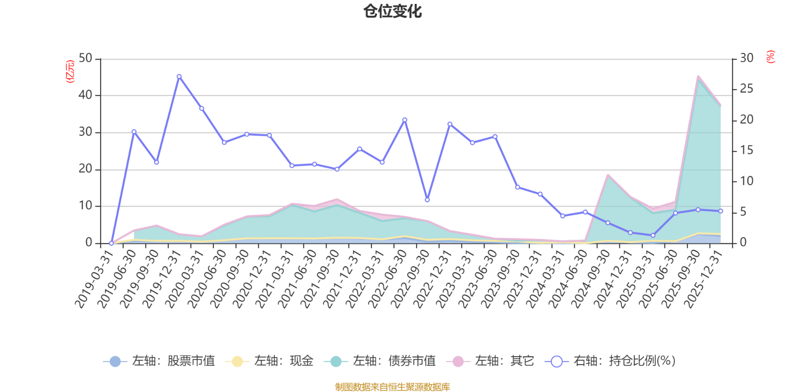 据定期报告数据统计,近三年平均股票仓位为6.86%,同类平均为72.57%。2019年末基金达到27.12%的最高仓位,2025年一季度末最低,为1.29%。