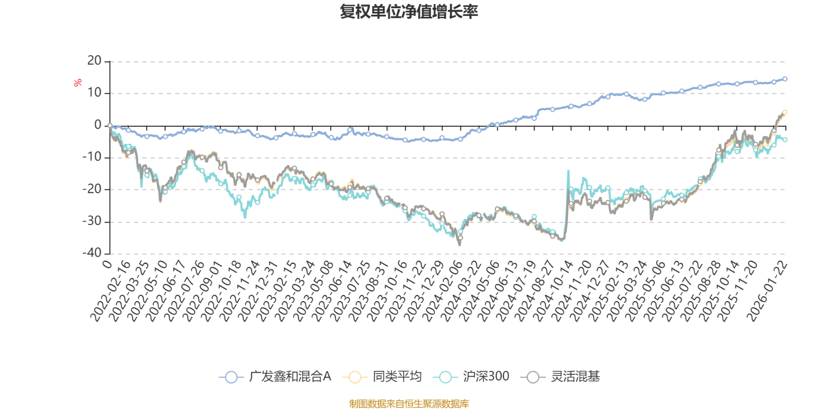 截至1月22日,广发鑫和混合A近三个月复权单位净值增长率为1.25%,位于同类可比基金1109/1286;近半年复权单位净值增长率为2.37%,位于同类可比基金1156/1286;近一年复权单位净值增长率为4.49%,位于同类可比基金1216/1286;近三年复权单位净值增长率为17.28%,位于同类可比基金611/1286。