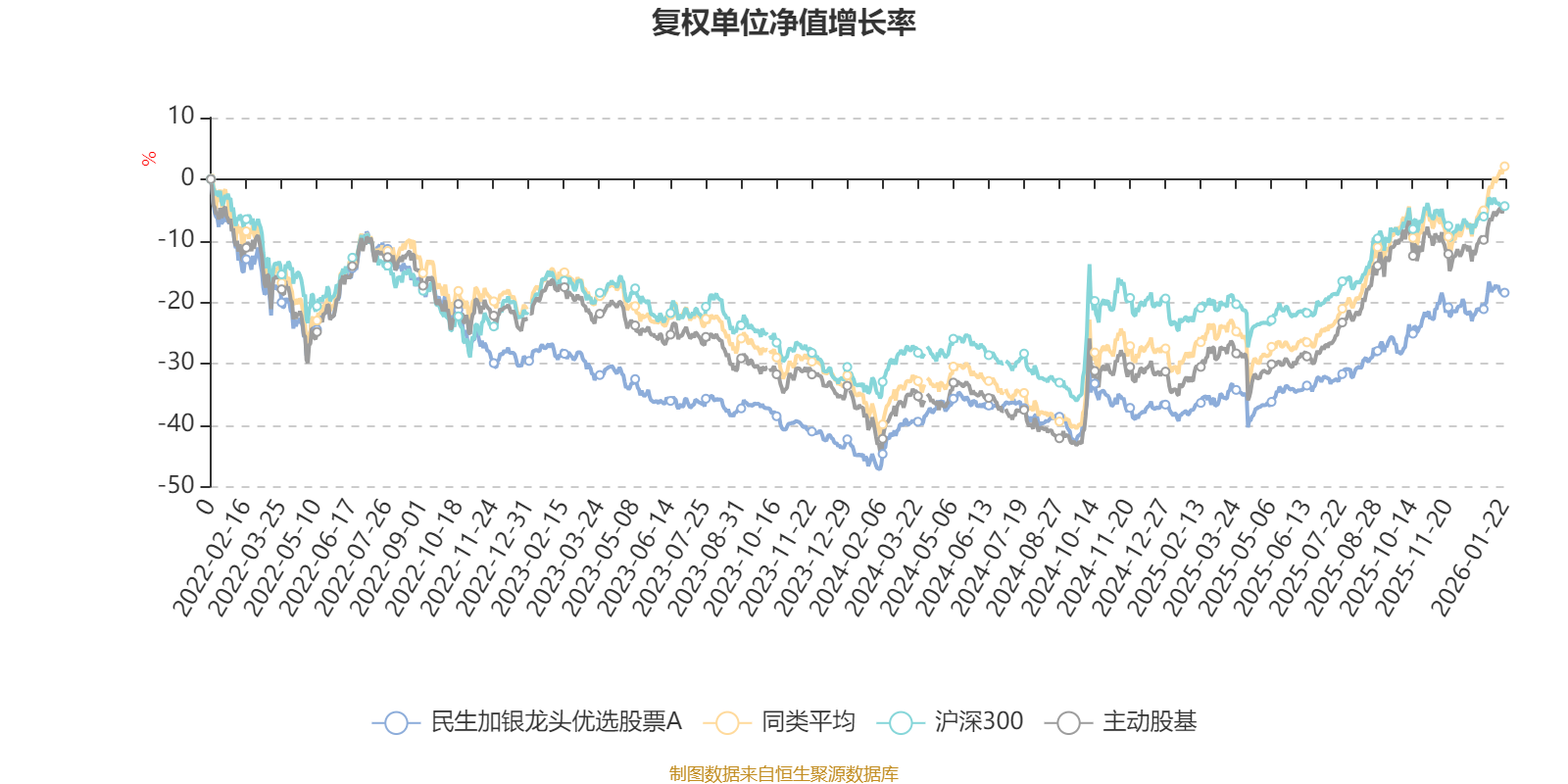 截至1月22日,民生加银龙头优选股票A近三个月复权单位净值增长率为7.30%,位于同类可比基金114/167;近半年复权单位净值增长率为19.39%,位于同类可比基金116/167;近一年复权单位净值增长率为32.18%,位于同类可比基金116/165;近三年复权单位净值增长率为11.78%,位于同类可比基金103/156。