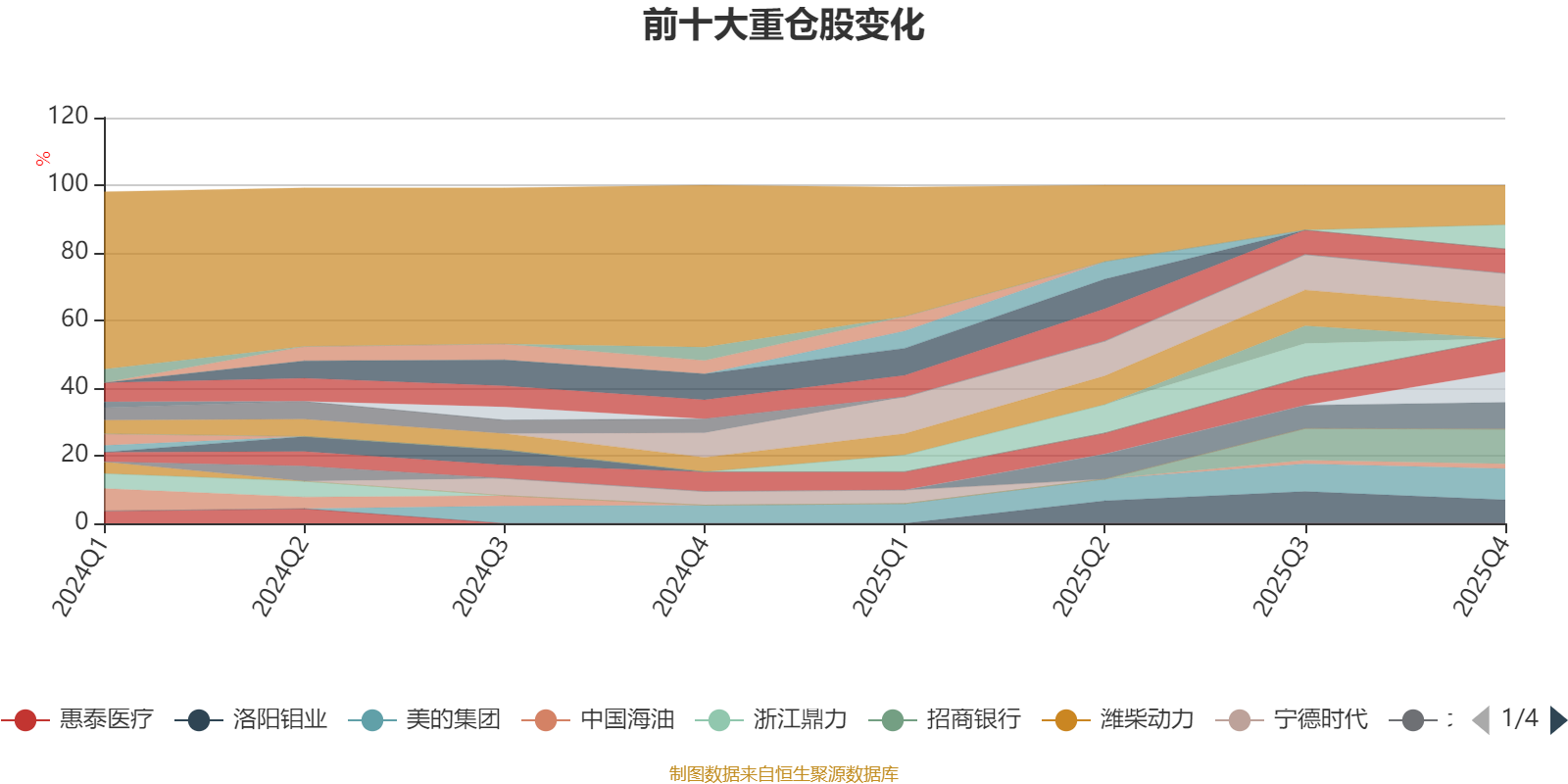 截至2025年四季度末,基金重仓股分别是招商银行、中国海洋石油、腾讯控股、紫金矿业、美的集团、中国人保、工商银行、中国移动、中国铝业、洛阳钼业、中国海油。
