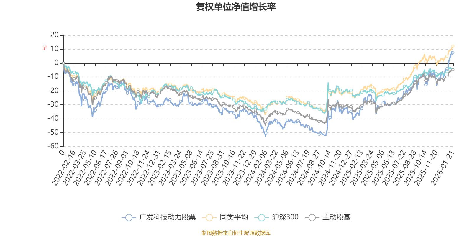 截至1月21日,广发科技动力股票近三个月复权单位净值增长率为21.49%,位于同类可比基金3/58;近半年复权单位净值增长率为35.90%,位于同类可比基金15/58;近一年复权单位净值增长率为66.81%,位于同类可比基金6/57;近三年复权单位净值增长率为46.99%,位于同类可比基金15/57。