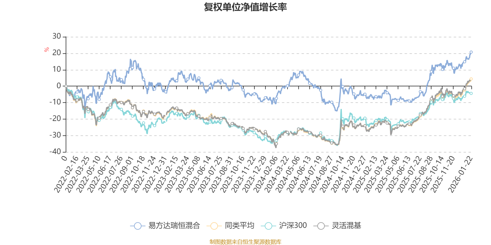 截至1月22日,易方达瑞恒混合近三个月复权单位净值增长率为8.27%,位于同类可比基金653/1286;近半年复权单位净值增长率为24.86%,位于同类可比基金554/1286;近一年复权单位净值增长率为28.87%,位于同类可比基金721/1286;近三年复权单位净值增长率为15.01%,位于同类可比基金664/1286。