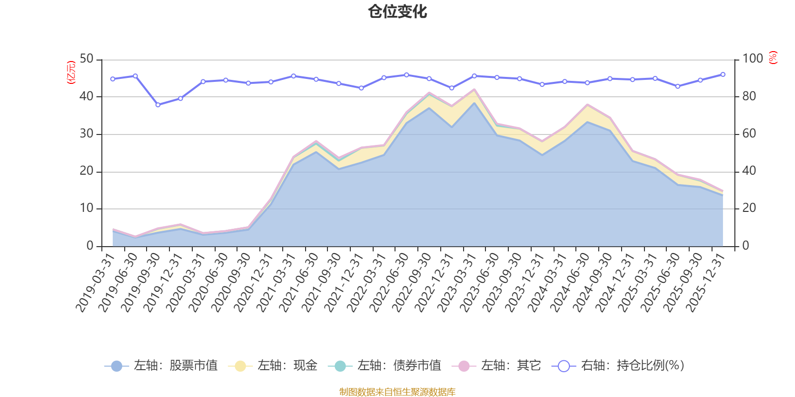 据定期报告数据统计,近三年平均股票仓位为89.14%,同类平均为72.57%。2025年末基金达到92.04%的最高仓位,2019年三季度末最低,为75.76%。