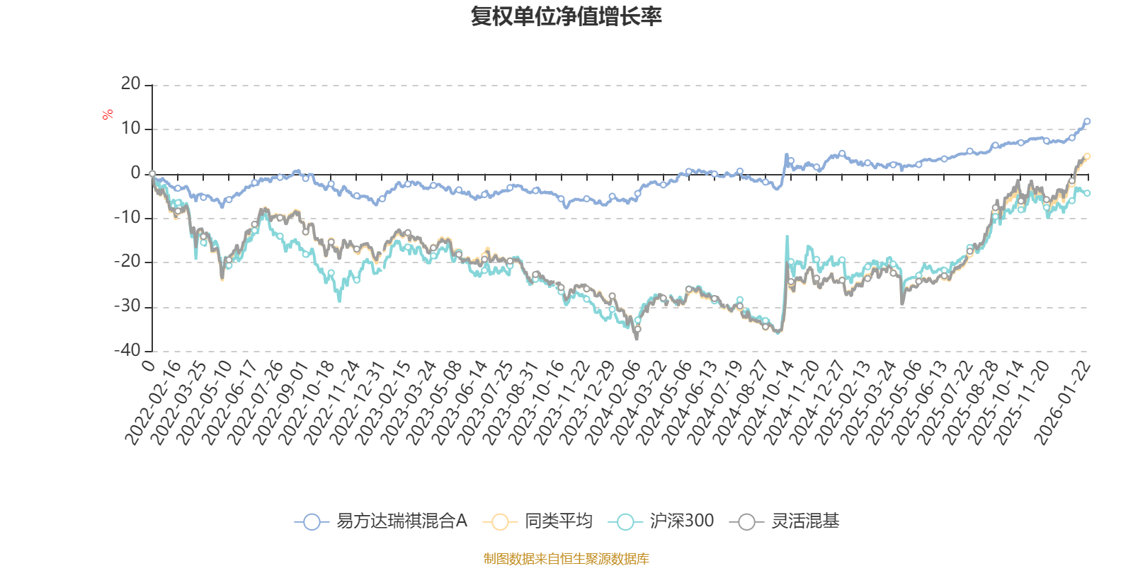 截至1月22日,易方达瑞祺混合A近三个月复权单位净值增长率为4.28%,位于同类可比基金894/1286;近半年复权单位净值增长率为6.39%,位于同类可比基金1029/1286;近一年复权单位净值增长率为9.60%,位于同类可比基金1096/1286;近三年复权单位净值增长率为15.36%,位于同类可比基金649/1286。