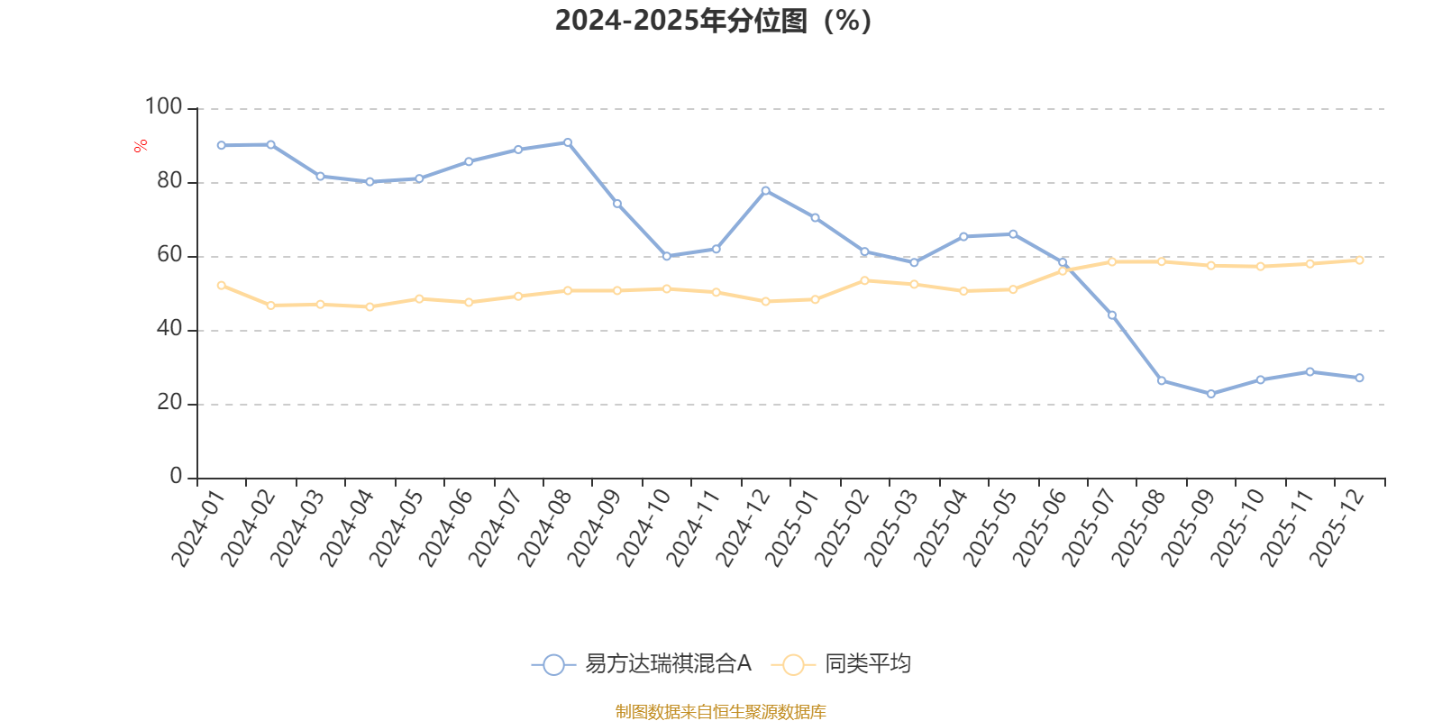 通过所选区间该基金净值增长率分位图,可以观察该基金与同类基金业绩比较情况。图为坐标原点到区间内某时点的净值增长率在同类基金中的分位数。