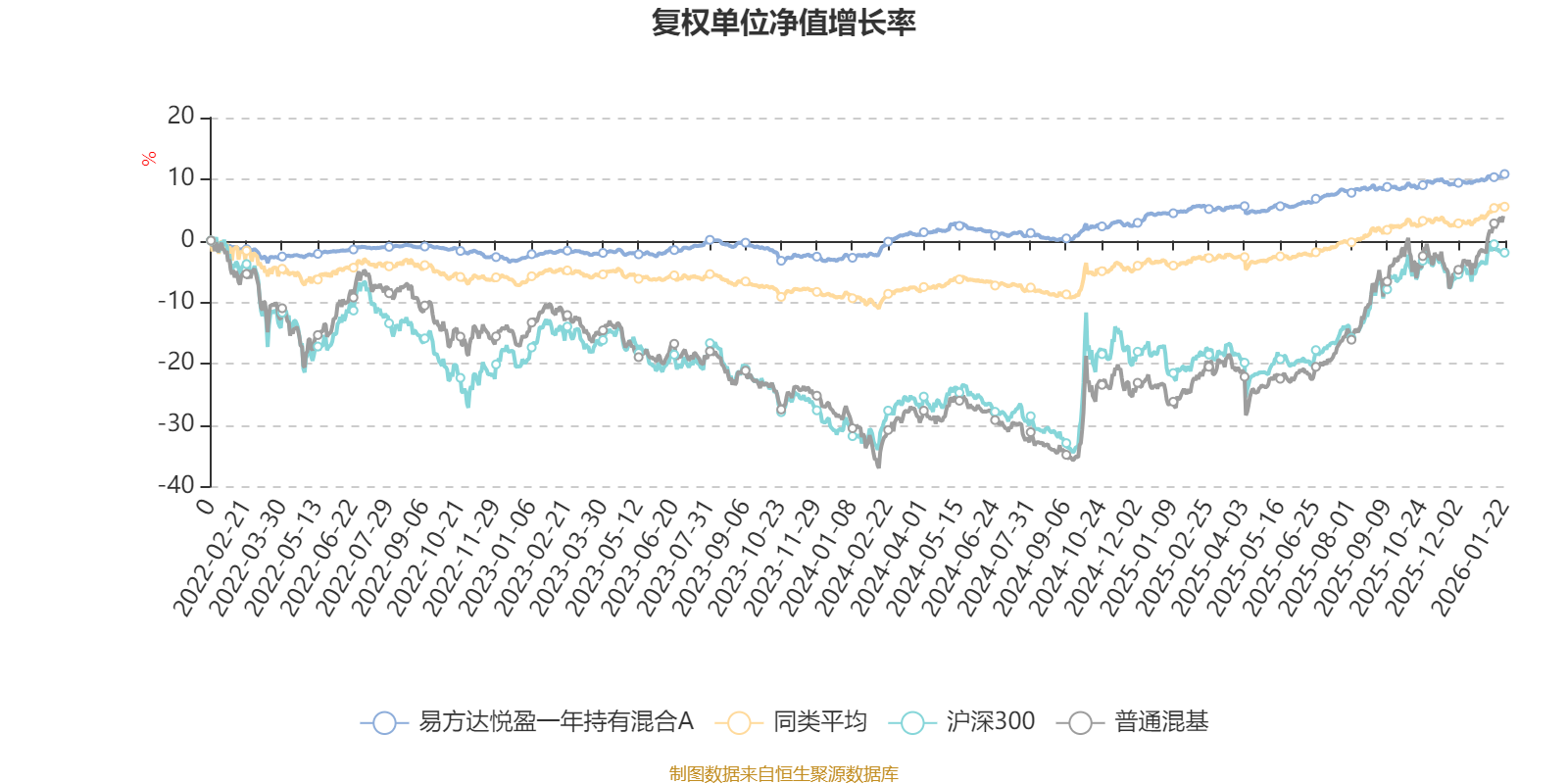 截至1月22日,易方达悦盈一年持有混合A近三个月复权单位净值增长率为1.87%,位于同类可比基金355/629;近半年复权单位净值增长率为2.29%,位于同类可比基金489/629;近一年复权单位净值增长率为5.84%,位于同类可比基金429/626;近三年复权单位净值增长率为13.08%,位于同类可比基金237/564。