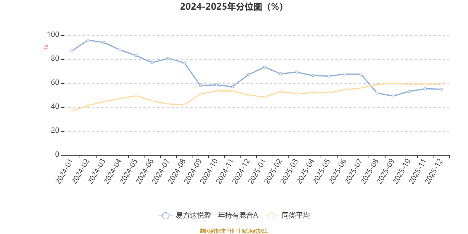 通过所选区间该基金净值增长率分位图,可以观察该基金与同类基金业绩比较情况。图为坐标原点到区间内某时点的净值增长率在同类基金中的分位数。
