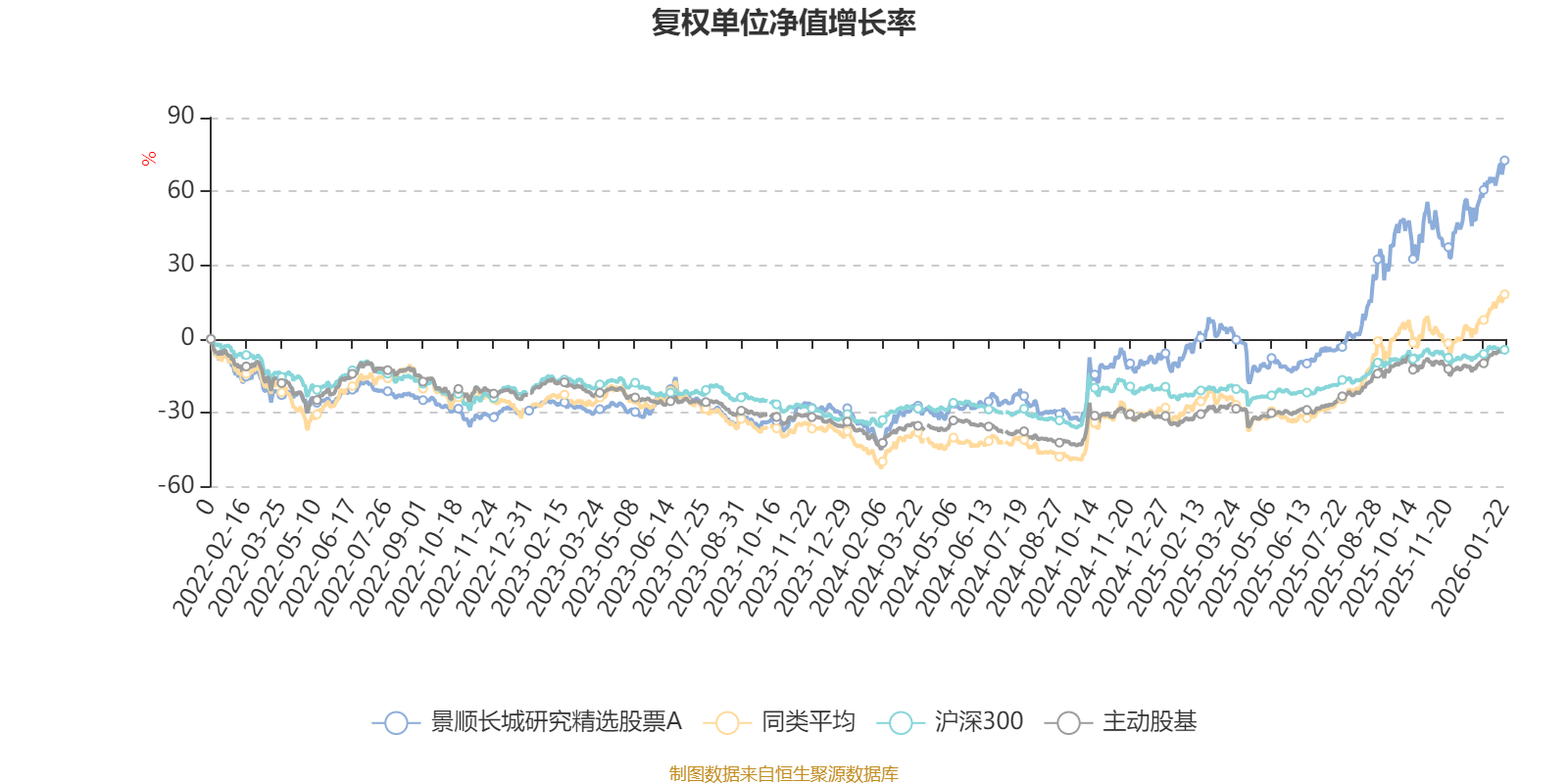 截至1月22日,景顺长城研究精选股票A近三个月复权单位净值增长率为21.58%,位于同类可比基金15/63;近半年复权单位净值增长率为78.37%,位于同类可比基金8/63;近一年复权单位净值增长率为76.77%,位于同类可比基金17/62;近三年复权单位净值增长率为129.85%,位于同类可比基金2/52。