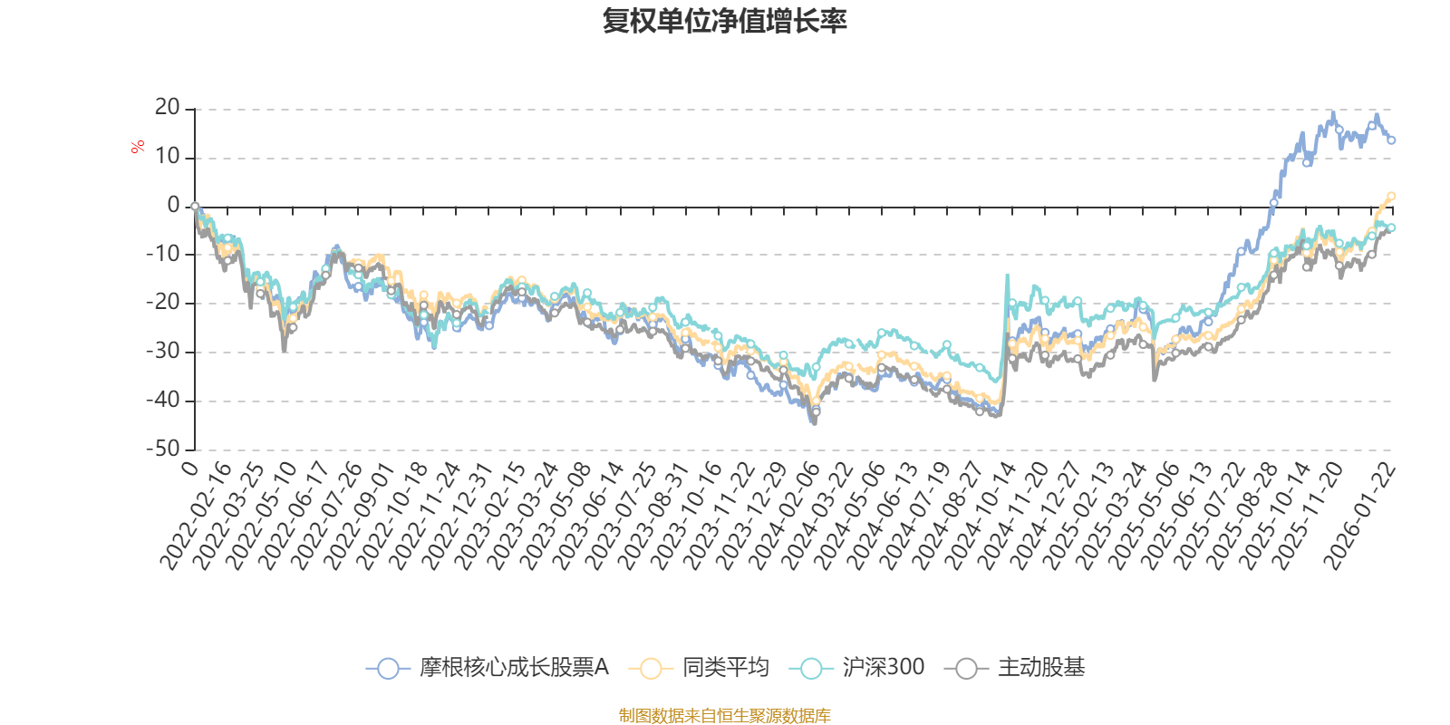 截至1月22日,摩根核心成长股票A近三个月复权单位净值增长率为2.65%,位于同类可比基金142/167;近半年复权单位净值增长率为25.12%,位于同类可比基金94/167;近一年复权单位净值增长率为55.89%,位于同类可比基金43/165;近三年复权单位净值增长率为40.40%,位于同类可比基金33/156。