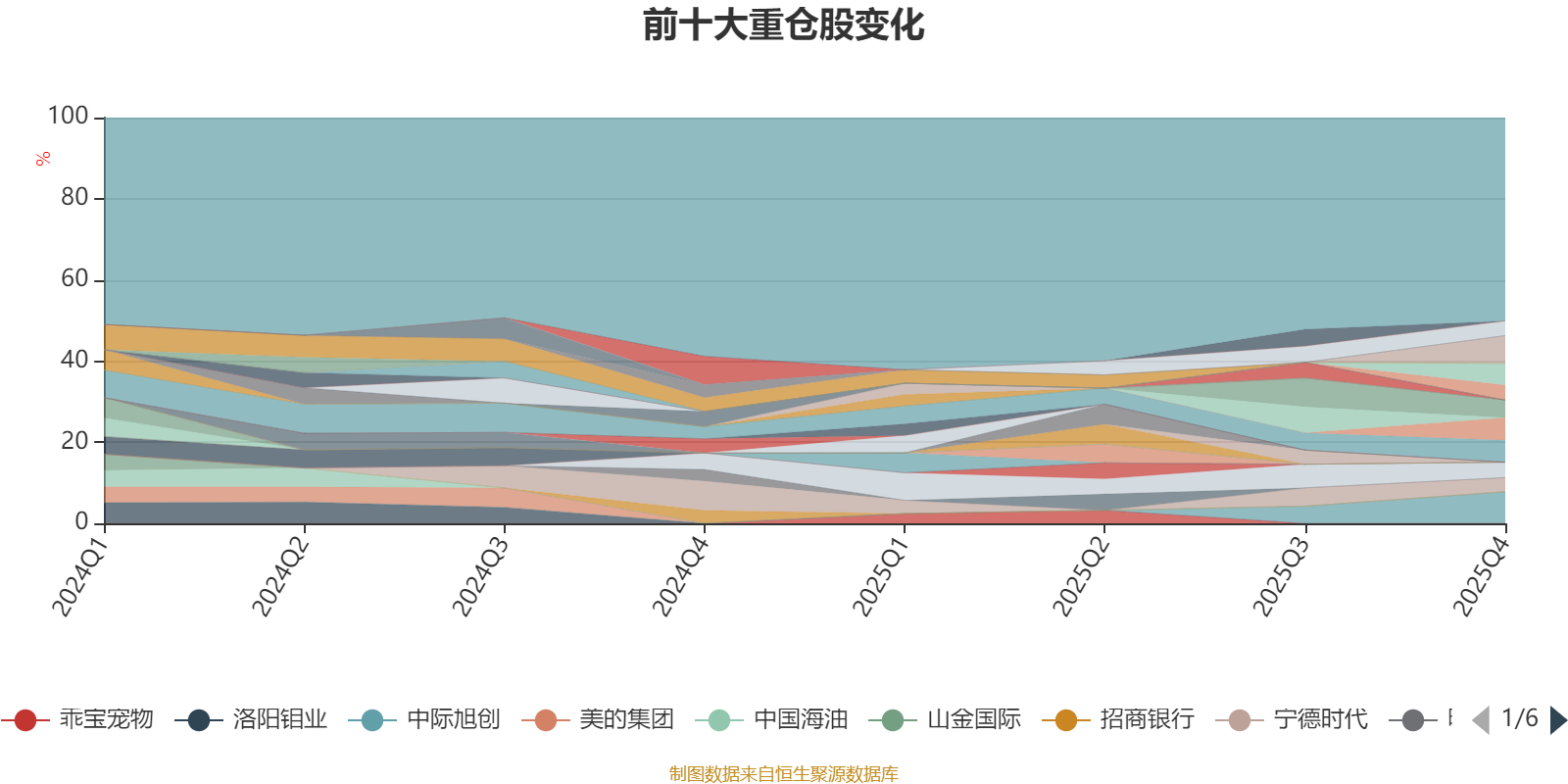 截至2025年四季度末,基金十大重仓股分别是中际旭创、中国平安、新易盛、紫金矿业、源杰科技、寒武纪、浙江荣泰、恒立液压、巨人网络、宁德时代。
