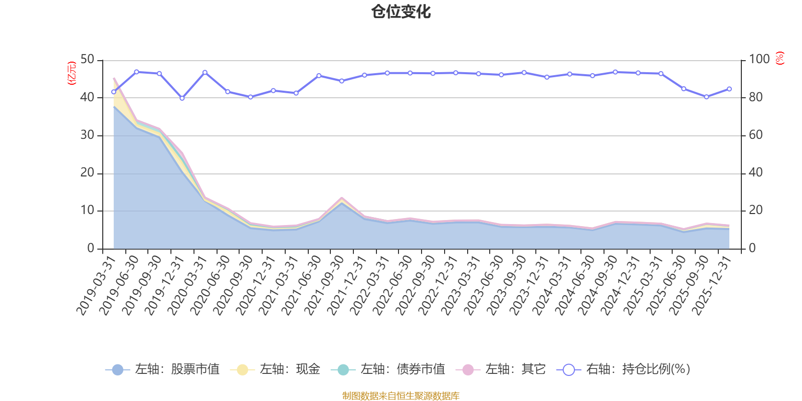 据定期报告数据统计,近三年平均股票仓位为90.32%,同类平均为88.27%。2019年上半年末基金达到93.79%的最高仓位,2019年末最低,为79.83%。