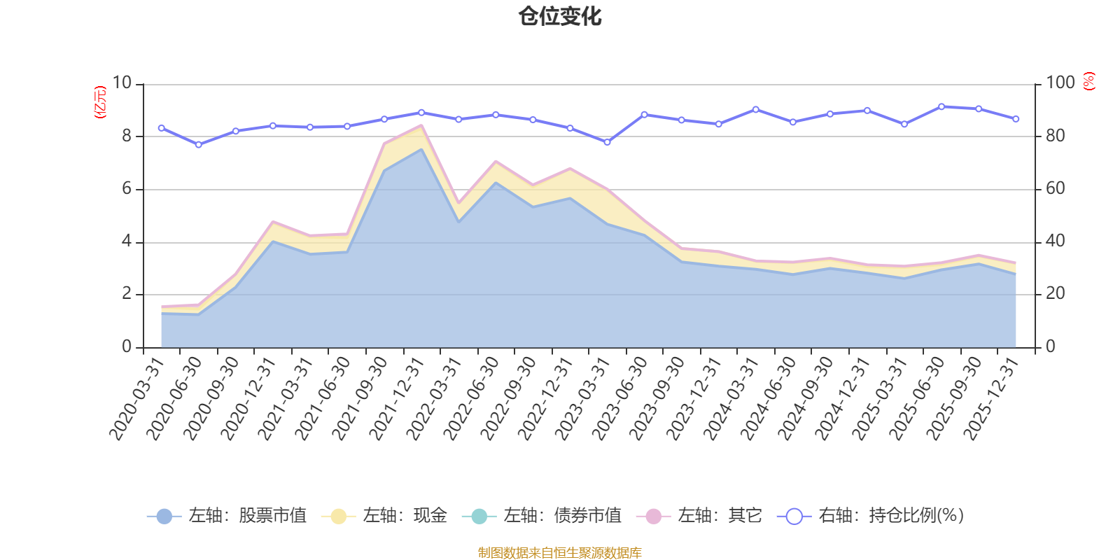 据定期报告数据统计,近三年平均股票仓位为87.12%,同类平均为88.27%。2025年上半年末基金达到91.42%的最高仓位,2020年上半年末最低,为76.99%。
