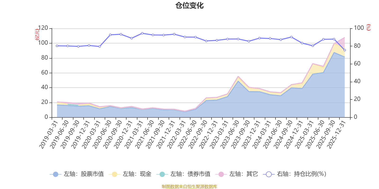 据定期报告数据统计,近三年平均股票仓位为85.98%,同类平均为88.36%。2021年一季度末基金达到94.44%的最高仓位,2025年末最低,为75.54%。