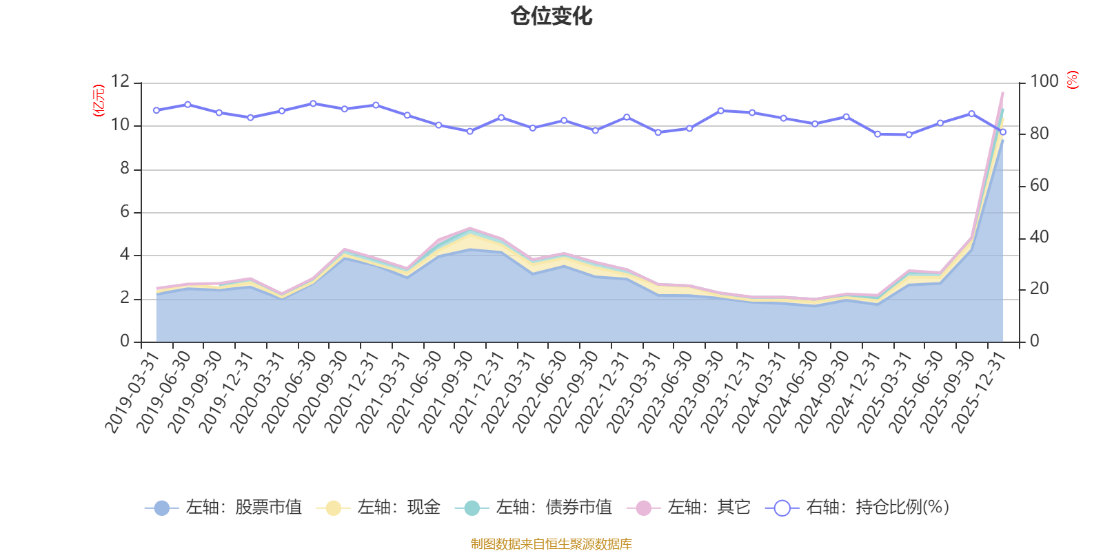 据定期报告数据统计,近三年平均股票仓位为84.3%,同类平均为88.27%。2020年上半年末基金达到91.96%的最高仓位,2025年一季度末最低,为79.95%。