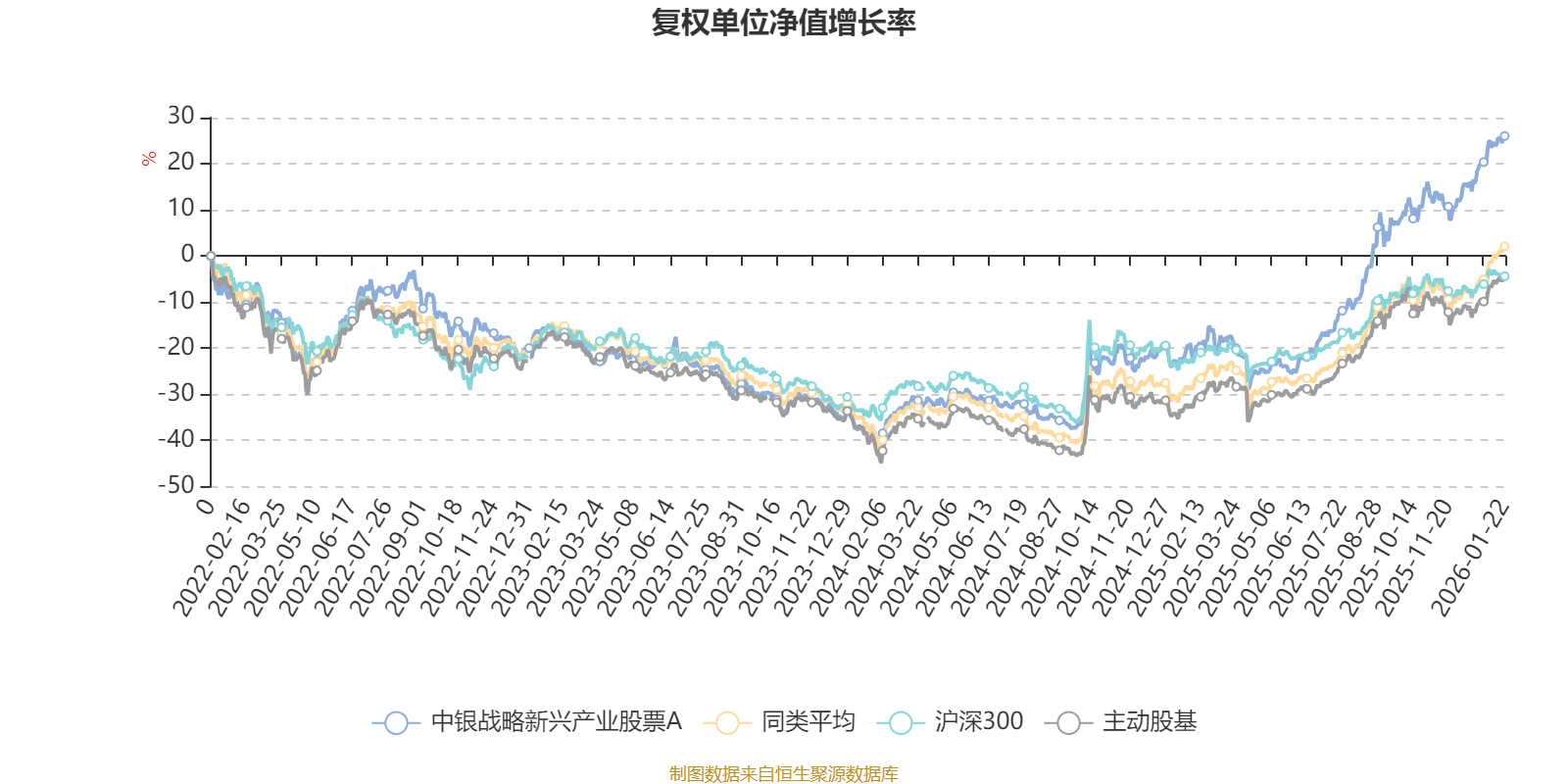 截至1月22日,中银战略新兴产业股票A近三个月复权单位净值增长率为13.90%,位于同类可比基金51/167;近半年复权单位净值增长率为42.98%,位于同类可比基金25/167;近一年复权单位净值增长率为56.01%,位于同类可比基金41/165;近三年复权单位净值增长率为48.90%,位于同类可比基金18/156。