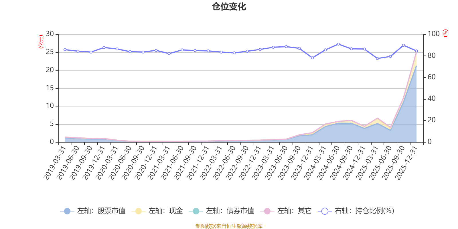 据定期报告数据统计,近三年平均股票仓位为85.25%,同类平均为89.51%。2024年上半年末基金达到90.95%的最高仓位,2025年一季度末最低,为77.59%。