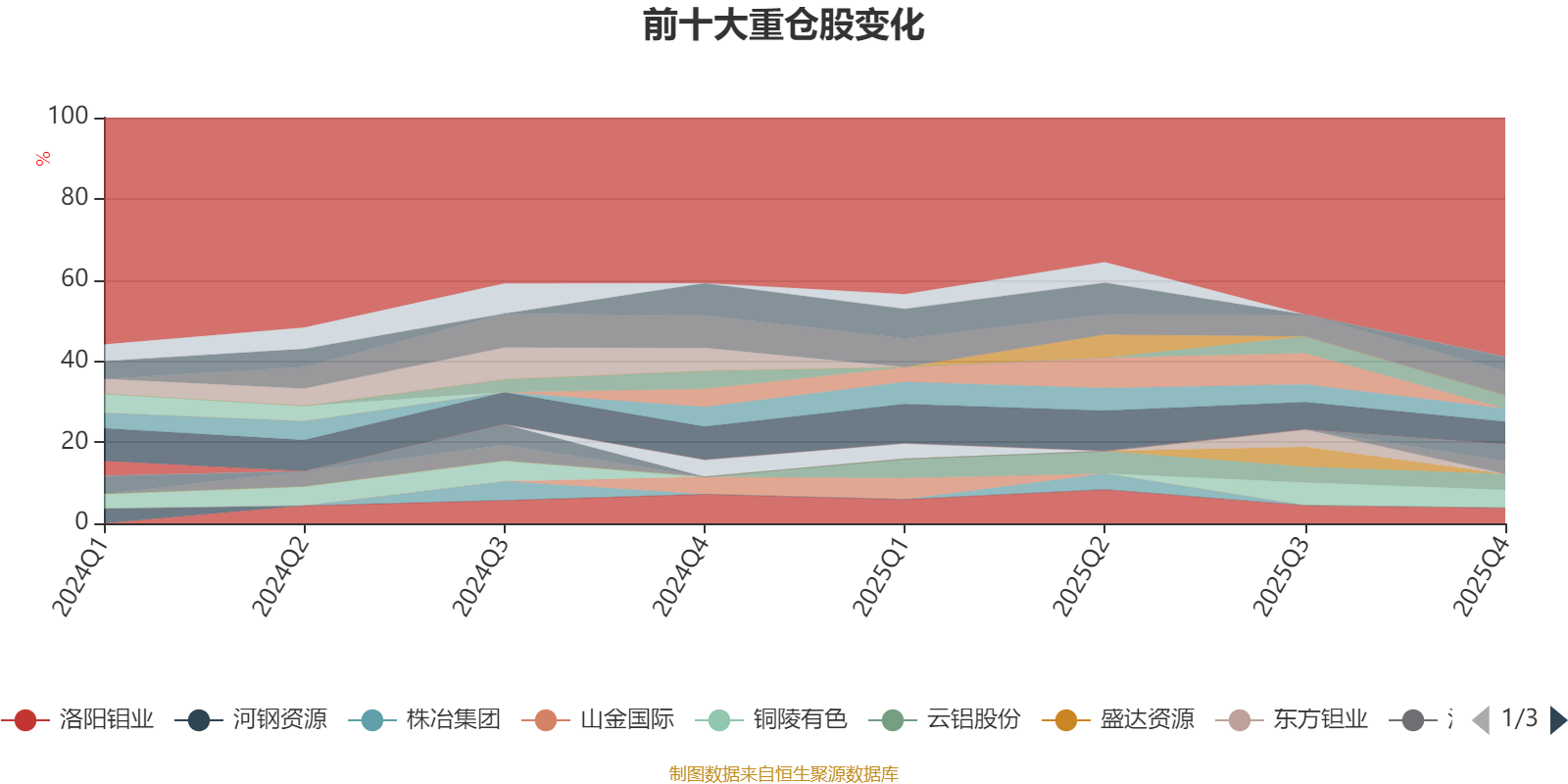 截至2025年四季度末,基金十大重仓股分别是中国铝业、紫金矿业、铜陵有色、藏格矿业、云铝股份、洛阳钼业、西部矿业、中矿资源、中金黄金、江西铜业。
