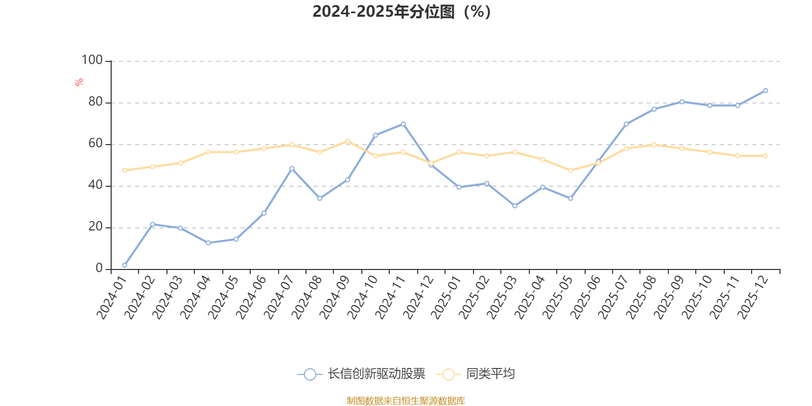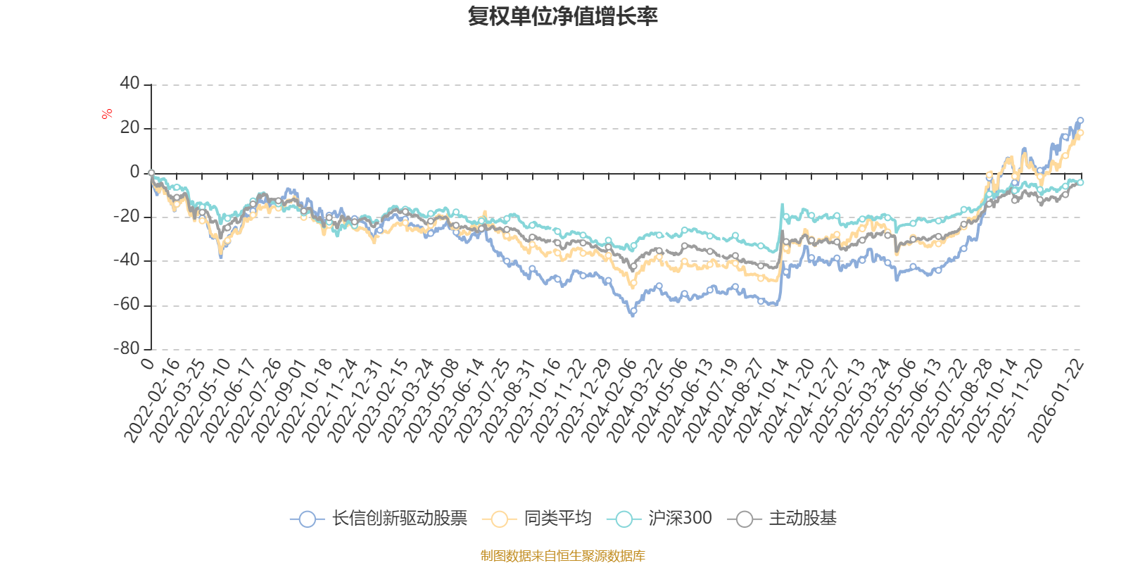 截至1月22日,长信创新驱动股票近三个月复权单位净值增长率为21.30%,位于同类可比基金19/63;近半年复权单位净值增长率为88.41%,位于同类可比基金2/63;近一年复权单位净值增长率为103.54%,位于同类可比基金4/62;近三年复权单位净值增长率为53.87%,位于同类可比基金31/52。