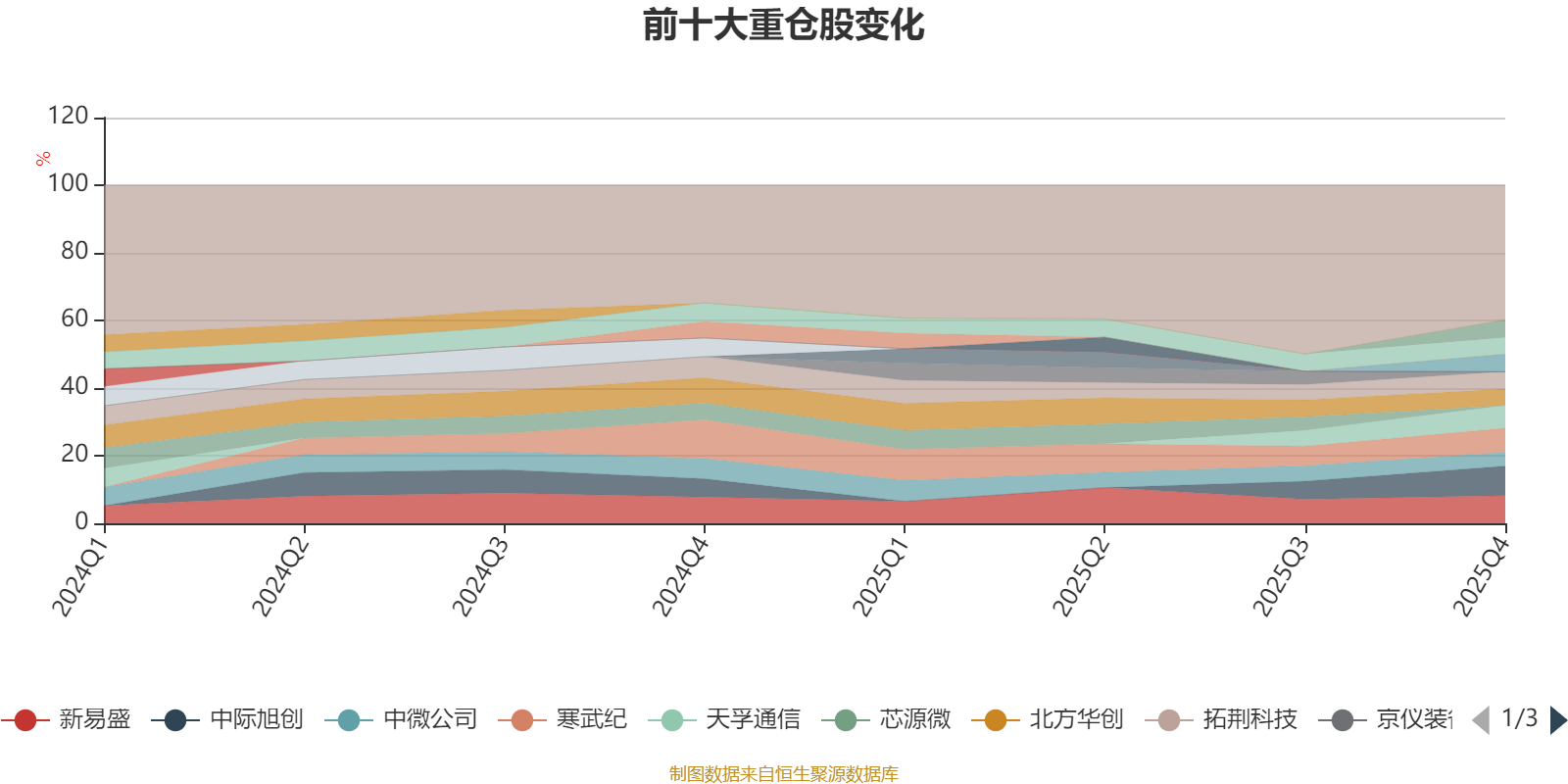 该基金持股集中度较高。截至2025年四季度末,基金十大重仓股分别是中际旭创、新易盛、寒武纪、天孚通信、源杰科技、长芯博创、拓荆科技、北方华创、沪电股份、中微公司。