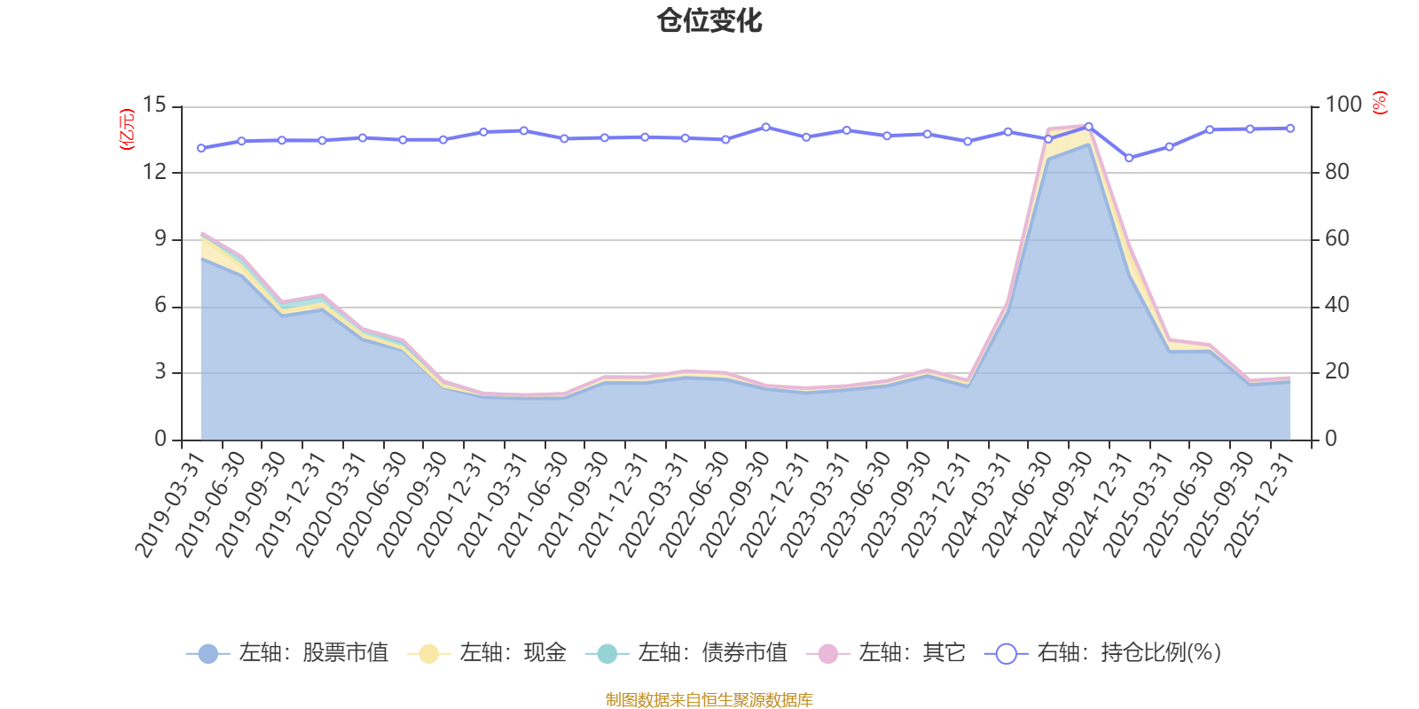 据定期报告数据统计,近三年平均股票仓位为91.15%,同类平均为88.27%。2024年三季度末基金达到93.93%的最高仓位,2024年末最低,为84.54%。