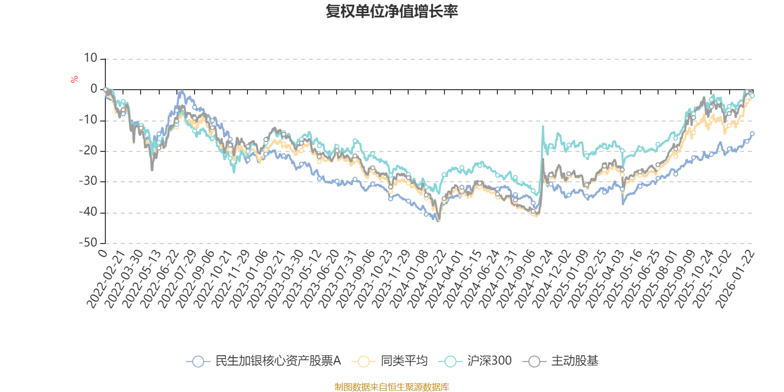 截至1月22日,民生加银核心资产股票A近三个月复权单位净值增长率为9.31%,位于同类可比基金67/121;近半年复权单位净值增长率为16.39%,位于同类可比基金78/121;近一年复权单位净值增长率为31.94%,位于同类可比基金77/119;近三年复权单位净值增长率为7.05%,位于同类可比基金61/89。