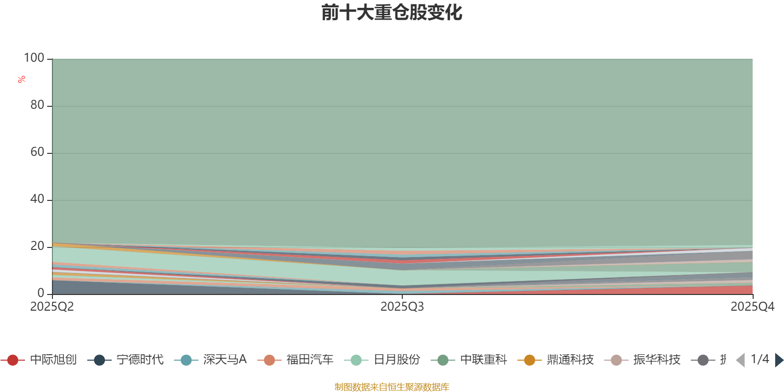 截至2025年四季度末,基金十大重仓股分别是中国巨石、中际旭创、立讯精密、海力风电、吉利汽车、格林美、振华科技、大华股份、中联重科、振华重工。