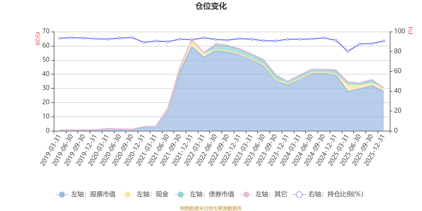 据定期报告数据统计,近三年平均股票仓位为90.22%,同类平均为88.36%。2020年三季度末基金达到94.14%的最高仓位,2025年一季度末最低,为80.16%。