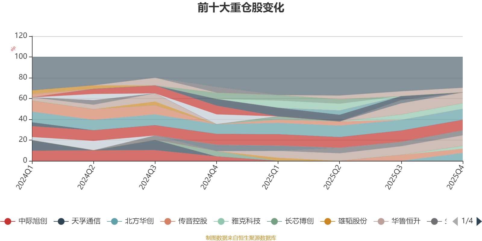 该基金持股集中度较高,近2年前十大重仓股集中度长期超过60%。截至2025年四季度末,基金十大重仓股分别是新易盛、立讯精密、沪电股份、华鲁恒升、北方华创、寒武纪、生益科技、深南电路、传音控股、雅克科技。