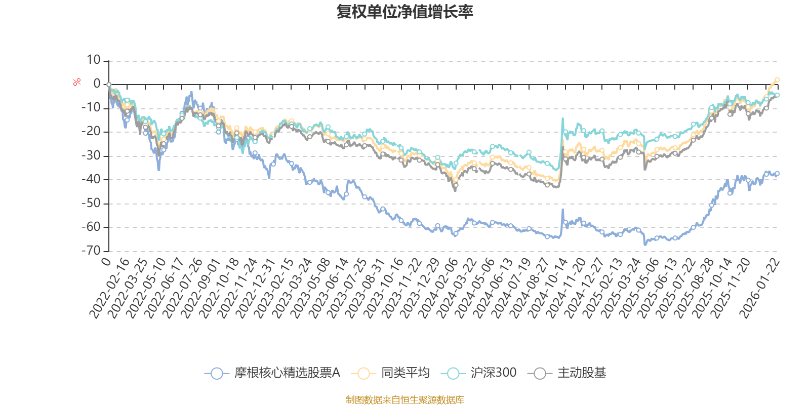截至1月22日,摩根核心精选股票A近三个月复权单位净值增长率为11.13%,位于同类可比基金80/167;近半年复权单位净值增长率为56.42%,位于同类可比基金6/167;近一年复权单位净值增长率为66.53%,位于同类可比基金9/165;近三年复权单位净值增长率为-10.03%,位于同类可比基金139/156。
